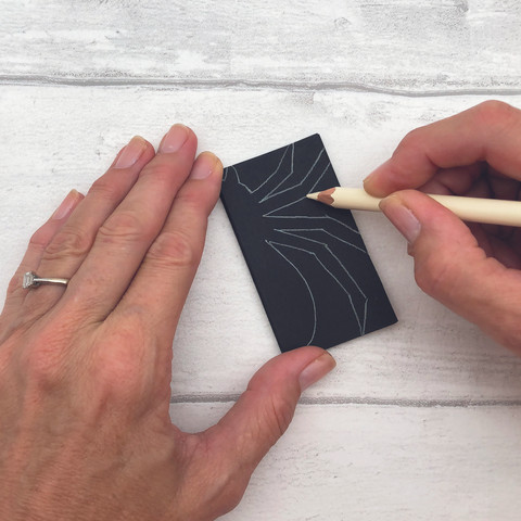 With a white pencil draw the outline of half a spider on the folded paper. Ensure the centre of the spider is along the fold and the middle two legs run off the side of the paper.